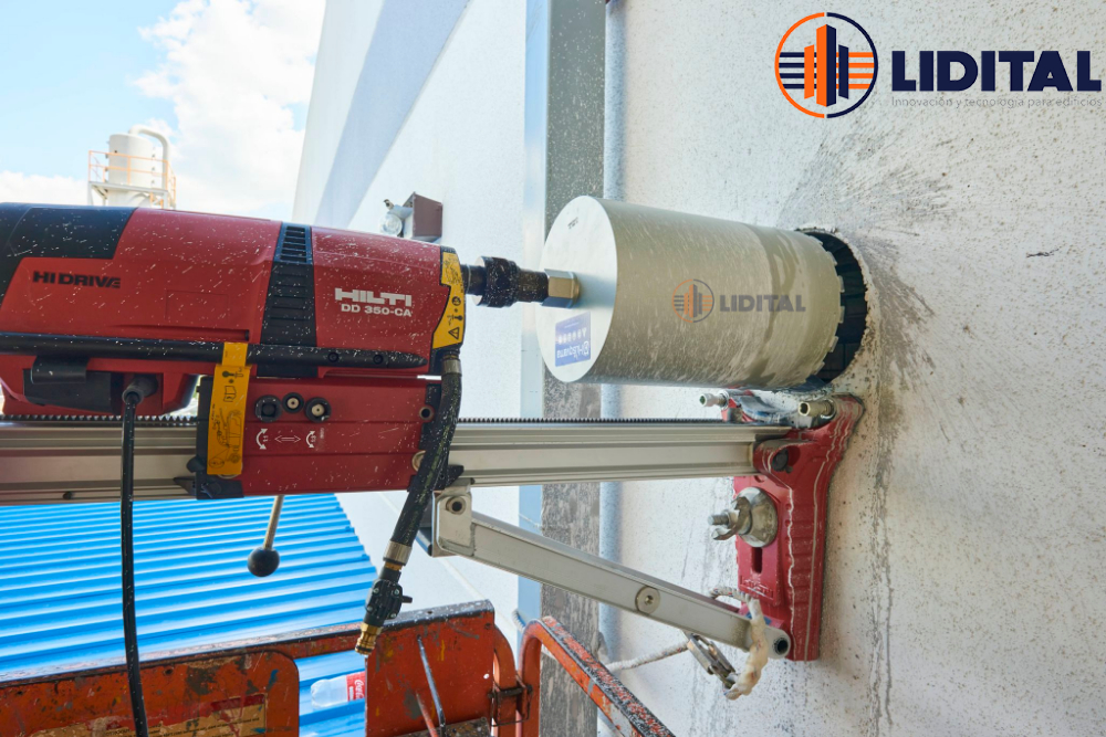 Abril de 2019 perforaciones de 202 y 225 mm. de diametro en muro de concreto reforzado de 250 mm. de espesor con varillas de 1″ utilizando maquinas de diamante HILTI DD-160 y DD-350, planta de luz diesel de 40KW.